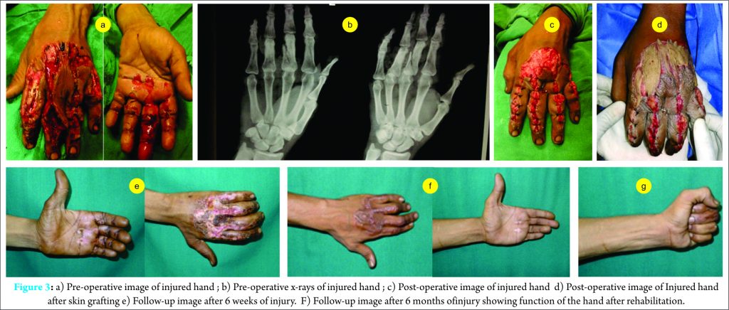 [Fig. 3: a) Pre-operative image of the injured hand b) Pre-Op X-rays of injured hand c)Post-operative image of the injured hand d) Image After Skin Grafting d) Image At 6 weeks follow-up f) Image at 6 months follow-up]