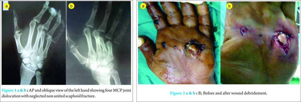 A 33-year-old manual worker male fell from a six-meter height on his outstretched left hand. He sustained subcapsular hematoma of the spleen which was treated conservatively based on an expectant management policy. The hand injury was missed from the start. All attention was directed toward the spleen injury. Upon discovery of the hand injury the patient was referred to our hospital eight days after the trauma. On examination, there was a wound on the volar aspect of the palm between the proximal and distal palmar creases with only the head of the fifth metacarpal was exposed. X-ray showed dorsal dislocation of the metacarpophalangeal joint of the index, long, ring and little fingers, in addition to old non united scaphoid waist fracture (Fig. 1).