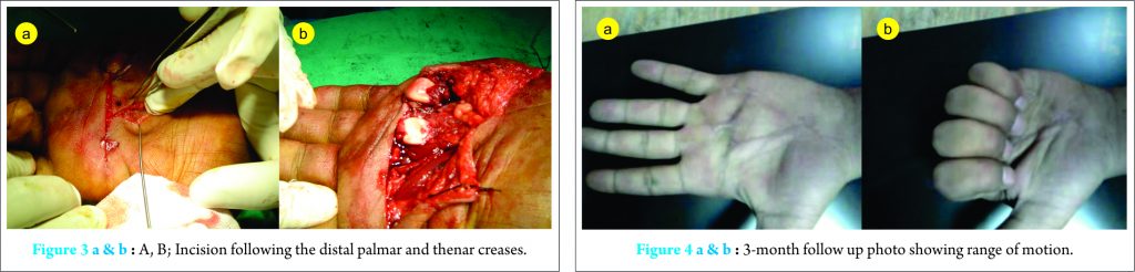 Under general anesthesia, trial of closed reduction of the open dislocation was attempted but failed. Decision was taken to proceed for open reduction using the volar approach. The wound was irrigated copiously with sterile saline, explored for foreign material (Fig. 2). Incision following the distal palmar and thenar creases was utilized. The incision at the palmar crease included the wound exposing the fifth metacarpal head (Fig. 3).