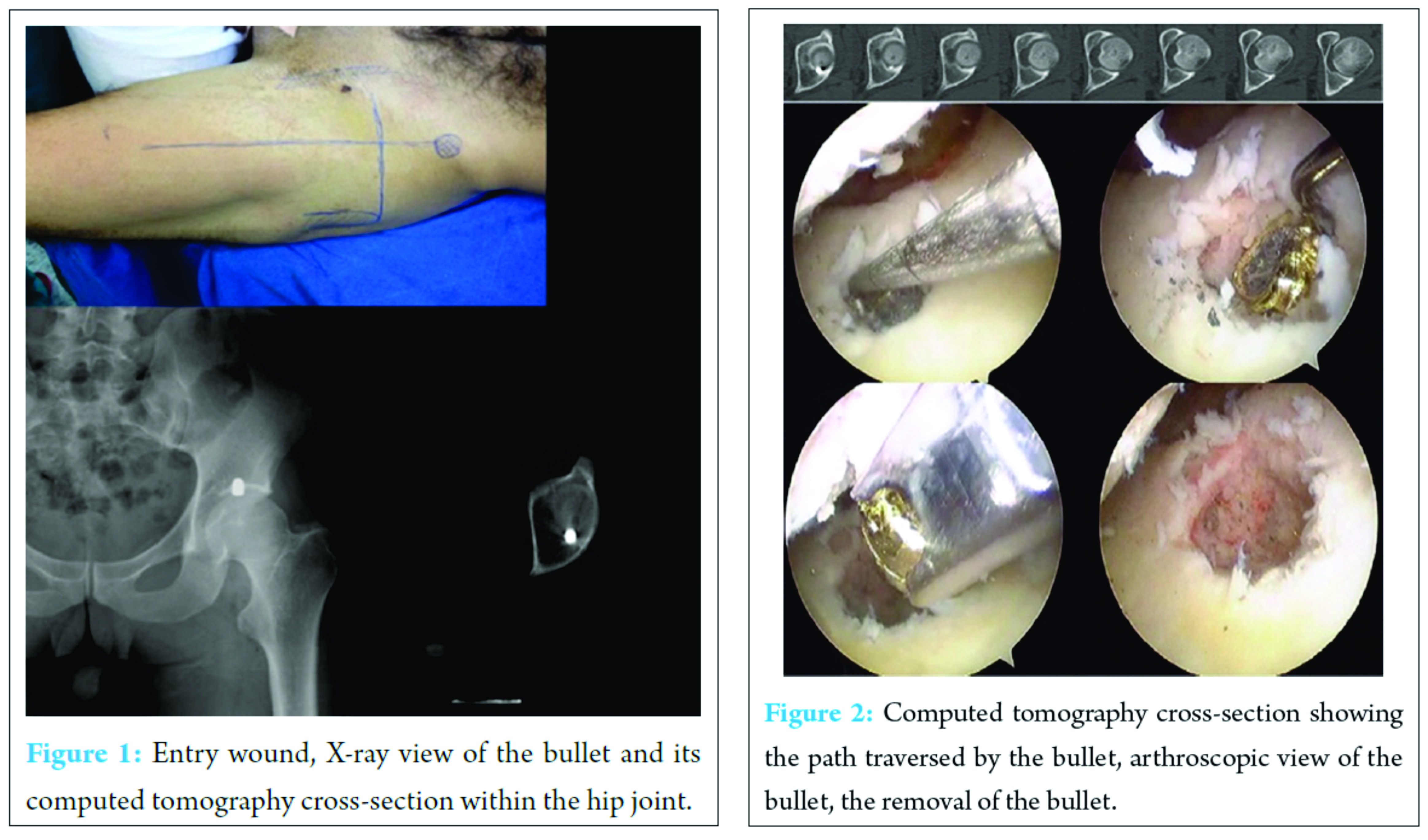 Case Presentation: Male patient aged 32 with a low-velocity gunshot wound was referred to emergency room on August 28, 2012. The projectile was lodged in acetabular side of hip joint transversing through femoral neck. A hip arthroscopy was performed for bullet removal. Two years after surgery patient had groin pain and underwent a safe dislocation for femoral chondral injury. In last follow up in the second postoperative year, the patient had no clinical complaint.