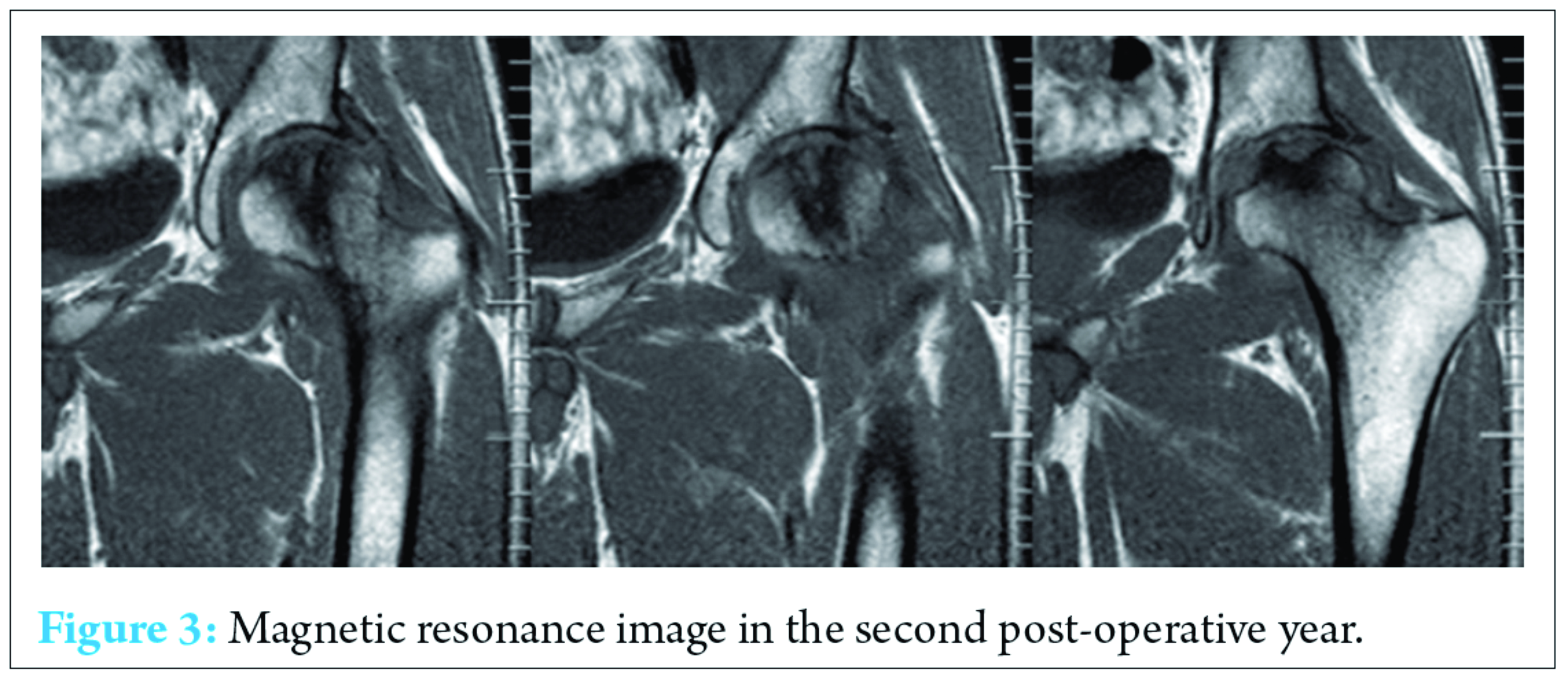 In second year of follow up period, patient appealed to hospital with groin pain. Patient had full range of motion but hip pain especially with weight bearing. Mr images were taken and the path traversed by the projectile through the femoral neck and 4×2 cm chondral defect on the femoral head were apparent (Fig. 3). No signs of osteoarthritis were detected.
