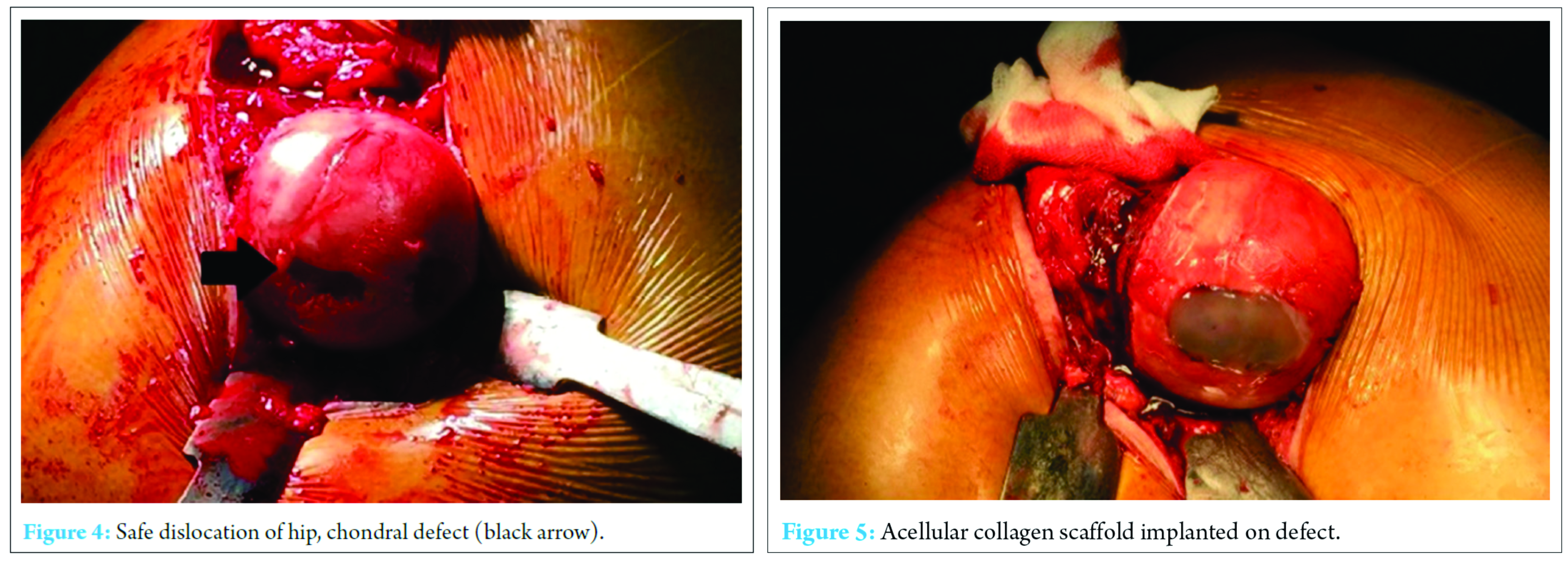 Patient was re-operated on March 2014. He was put on surgery table in lateral decubitis position with general anesthesia and safe surgical dislocation of the hip was applied (Fig. 4). Dissolved cartilage was removed and microfracture was applied to subchondral bone. Acellular collagen scaffold (marka model) was implanted on chondral defect area and fixed with fibrin glue (Fig. 5). No complication was observed post-operatively. Passive motions were allowed after two days and weight bearing was prohibited for six weeks.