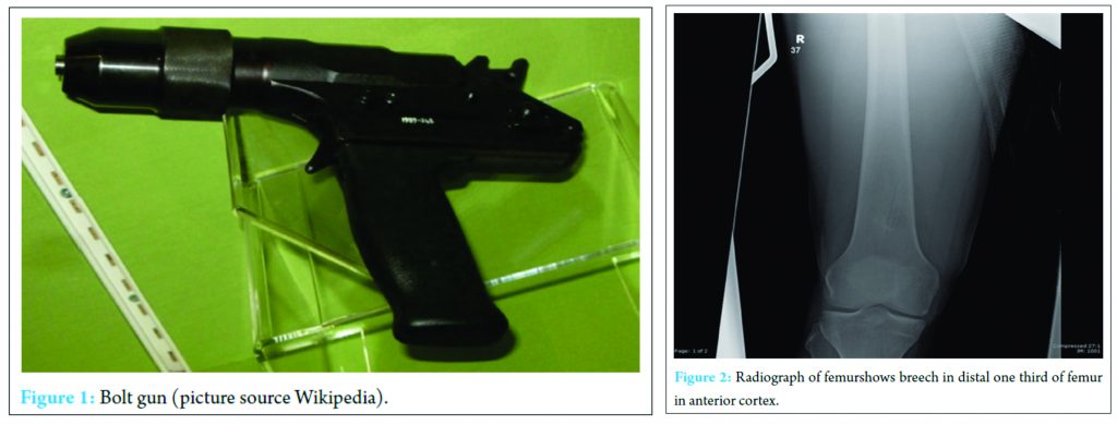 Case Report A 28-year-old male presented to our Accident and Emergency department after accidental injury to his right thigh with bolt gun. He had an entry wound measuring 2 cm in length and 1 cm in breadth over anterior aspect of lower one third of thigh at lower and sustained Grade II compound fracture of right femur shaft at distal one third. The wound was treated with multiple debridements, negative pressure wound therapy and intravenous antibiotics based on culture and sensitivity.