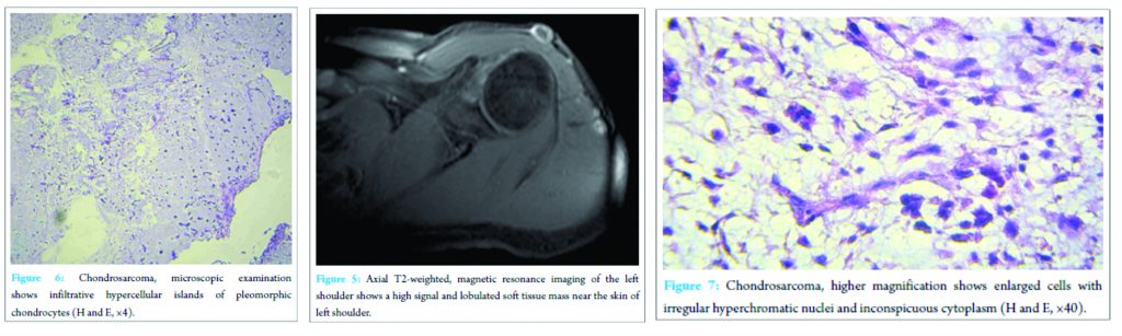Extraskeletal chondrosarcomas is an aggressive and rare soft tissue sarcoma which arises from extraskeletal origin in comparison with skeletal type [1-4]. This cartilaginous malignancy firstly reported by Stout and Verner in 1953 and histologic properties were quite similar to skeletal ones [5,9]. These malignant tumors are classified to myxoid and mesenchymal based on histologic criteria. Myxoid type is more common than other. At first time, EMC was described by Lightenstein in 1959 as a low-grade soft-tissue sarcoma which was too rare in the upper extremities. Literature review shows there are just a few cases of this kind of soft tissue tumor ;besides, it is very rare in the shoulder area [9,10].