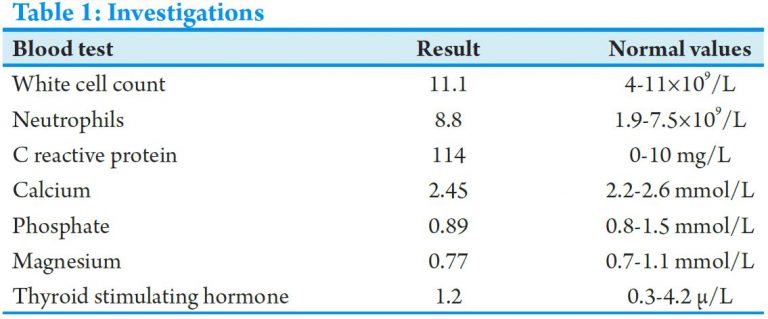 The patient was then admitted for intravenous antibiotics and strict elevation. Blood tests showed mild neutrophilia (8.8) and elevated CRP (114). Calcium, magnesium, liver function and thyroid function tests were all within range. All investigations carried out on admission are summarized in [Table 1].