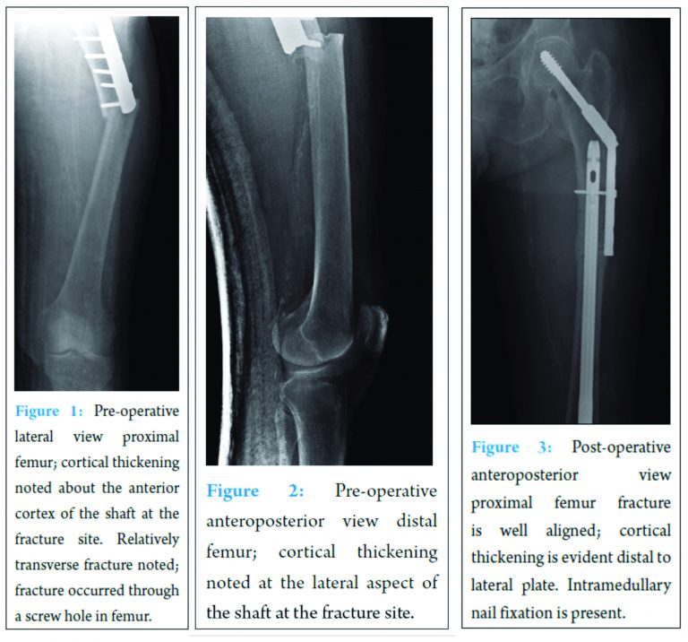 Case Presentation: In April 2014 a 90 year old female presented in with left thigh pain after a fall from standing height. She had a previous fixation of a left intertrochanteric hip fracture with a sliding hip screw in 1999 and a 9 year history of bisphosphonate therapy. Radiographs obtained in the ED revealed a left-sided femoral shaft fracture at the distal aspect of the previously applied five hole side plate. Of note, the periprosthetic fracture demonstrated cortical thickening at the fracture site of the lateral femoral cortex, lack of comminution as well as a transverse appearance. The patient was taken to the operating room the next day for retrograde placement of an intramedullary nail of the left femur with revision of left intertrochanteric femur fracture fixation. By three months postoperatively she had obtained full radiographic union.
