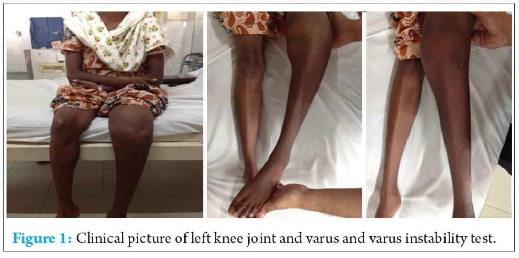 On examination, diffuse swelling was noted over left knee. Knee flexion was possible up to 90 degrees with some extensor lag. Gross abnormal mobility was present in both sagittal and coronal planes (Fig. 1). Anterior and posterior drawer tests were positive. Valgus and varus instability tests were also positive.