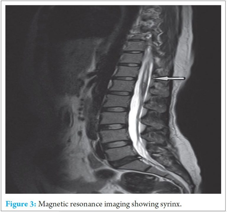 MRI of whole spine was done which show syrinx at D7, D9, D10 & D12 and L1 level. (Refer Fig.3)