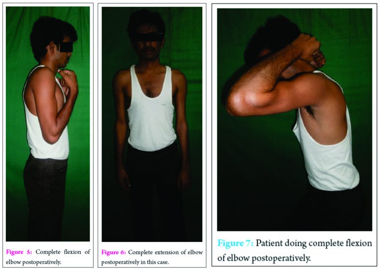 At follow up the radiographs showed adequate excision of the tumor. (Fig 4) The patient gained a full range of movement at the elbow,(Figs 5,6,7) and was functionally restored. At the follow up taken before the writing of this report which accounts for 5 years the radiographs showed no signs of recurrence. There were no signs of any systemic spread of the tumor.