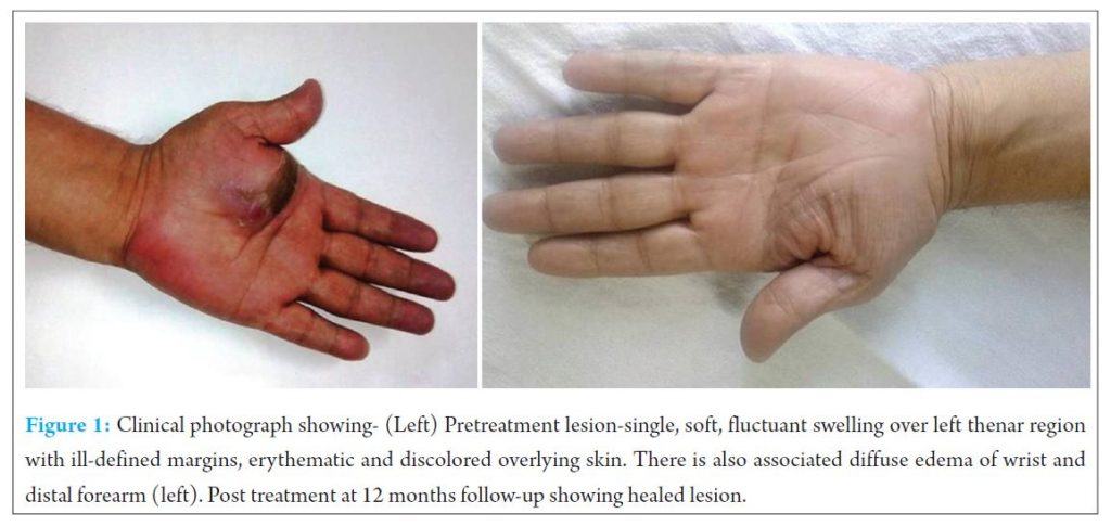 We present a case of 58-year-old male patient who presented to the outpatient department of the author’s tertiary level institute with swelling over thenar region of left hand. He was a fully independent, non smoker, right handed, asthamatic patient on inhalational corticosteroids since five years. He noted a small, painful swelling in left thenar region five months back. He visited a local orthopedician who advised him to get FNAC of the swelling. FNAC report suggested diagnosis of ganglion/synovial cyst and conservative treatment was started, but the swelling did not decrease in size, rather gradually increased in size and became painful with other signs of inflammation. It also affected the movements at the wrist.