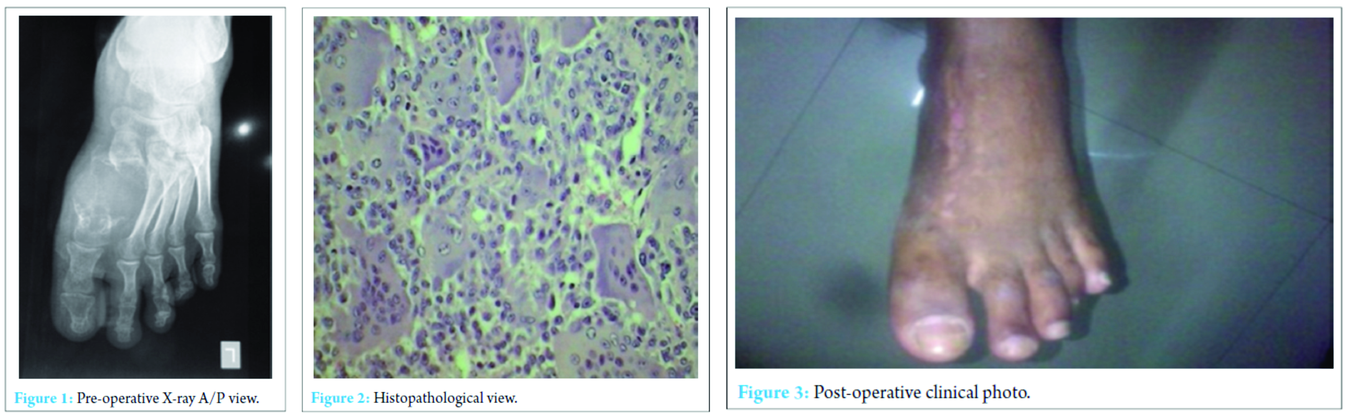 Case Report: A 40-year-old male presented with complain of swelling over the dorsum of left foot for the duration of 2 years and pain in that foot for 4 months. Swelling was insidious in onset and has progressively increased in size. Pain was mild to moderate in intensity, dull aching and continuous. On examination, there was a localized ovoid shaped swelling 7 by 4 cm over the dorsum of the left foot opposing 1st and 2nd metatarsal area with well-defined margins, tender on deep palpation, hard in consistency and the overlying skin was free. Radiographs revealed an expansile osteolytic lesion of entire 1st metatarsal involving the articular surface of tarsometatarsal joint and metatarsophalangeal joint with impingement on 1st metatarsal and cortical thinning. The classical “soap bubble appearance” was also present. Fine needle aspiration cytology was done to confirm our diagnosis of GCT. According to Campanacci et al., the tumor was histologically graded as Grade II tumor. A reconstructive surgery with fusion of the Cuneiform metatarsa and metatarsophalangeal joint was planned. The tumor was carefully removed with a cuff of normal tissue and the proximal and distal joints were inspected. There was no articular cartilage of the Cuneiform metatarsa joint. A fibular graft was taken and was inserted into the troughs created in medial cuineform and proximal phalanx and fixed with K-wire, both proximally and distally. The patient was given a below knee cast for three months postoperatively. Full weight bearing was started after 3 months. After 9 months of follow-up, the graft was well taken up and there were no signs of recurrence both clinically and radiologically.