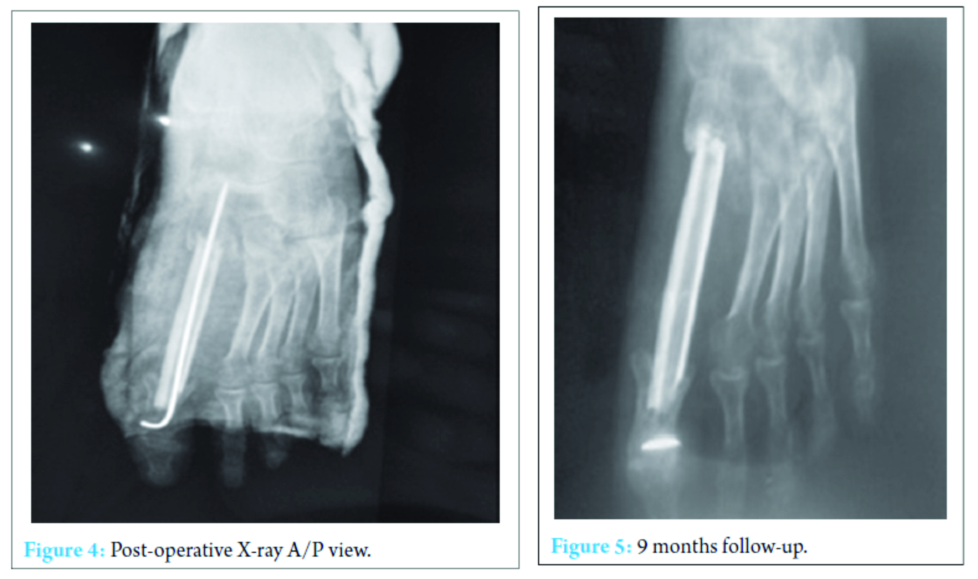 A reconstructive surgery with fusion of the Cuneiform metatarsal and metatarsophalangeal joint was planned. The tumor was carefully removed with a cuff of normal tissue and the proximal and distal joints were inspected. There was no articular cartilage of the Cuneiform metatarsa joint. A fibular graft was taken and was inserted into the troughs created in medial cuineform and proximal phalanx and fixed with K-wire, both proximally and distally (Fig. 3 and 4) [10]. The patient was given a below knee cast for three months postoperatively. Full weight bearing was started after 3 months. After 9 months of follow-up, the graft was well taken up and there were no signs of recurrence both clinically and radiologically (Fig. 5).