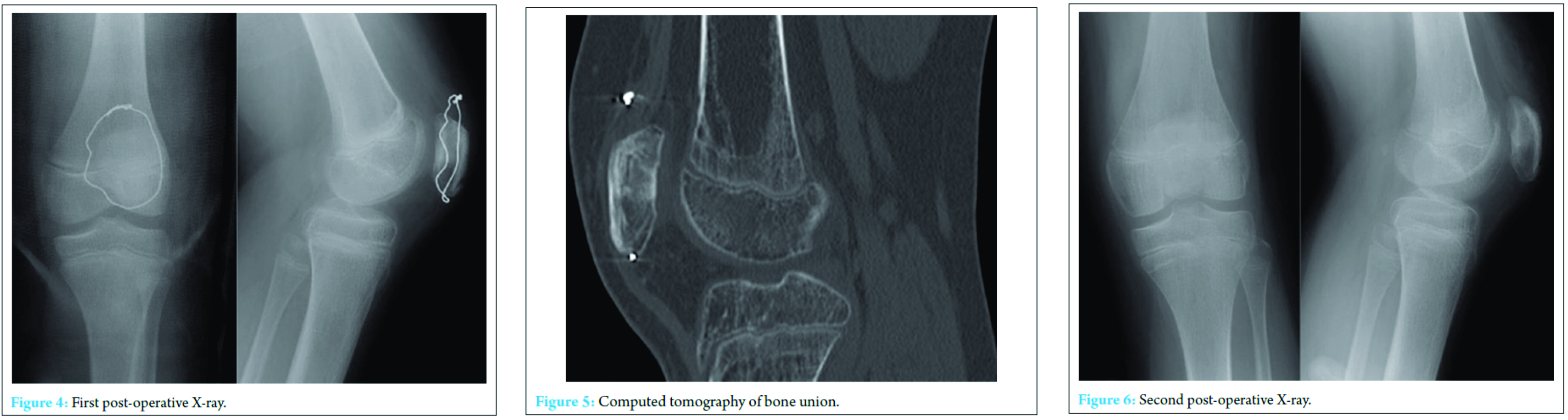 The knee joint was immobilized in a cylinder cast for 4 weeks after surgery. Physical rehabilitation was started, and eventually, the patient made a successful recovery. At 9 months after surgery, there was no extension lag, and the active range of motion of the injured knee was 0-140° of flexion. Callus formation over the fracture site and bone union was confirmed (Fig. 5), and the cerclage wire was removed (Fig. 6). To date, he had no further symptoms and has been able to carry out all types of physical activities, including skateboarding. The patient and his parents were asked if data concerning the case could be submitted for publication, and they consented.
