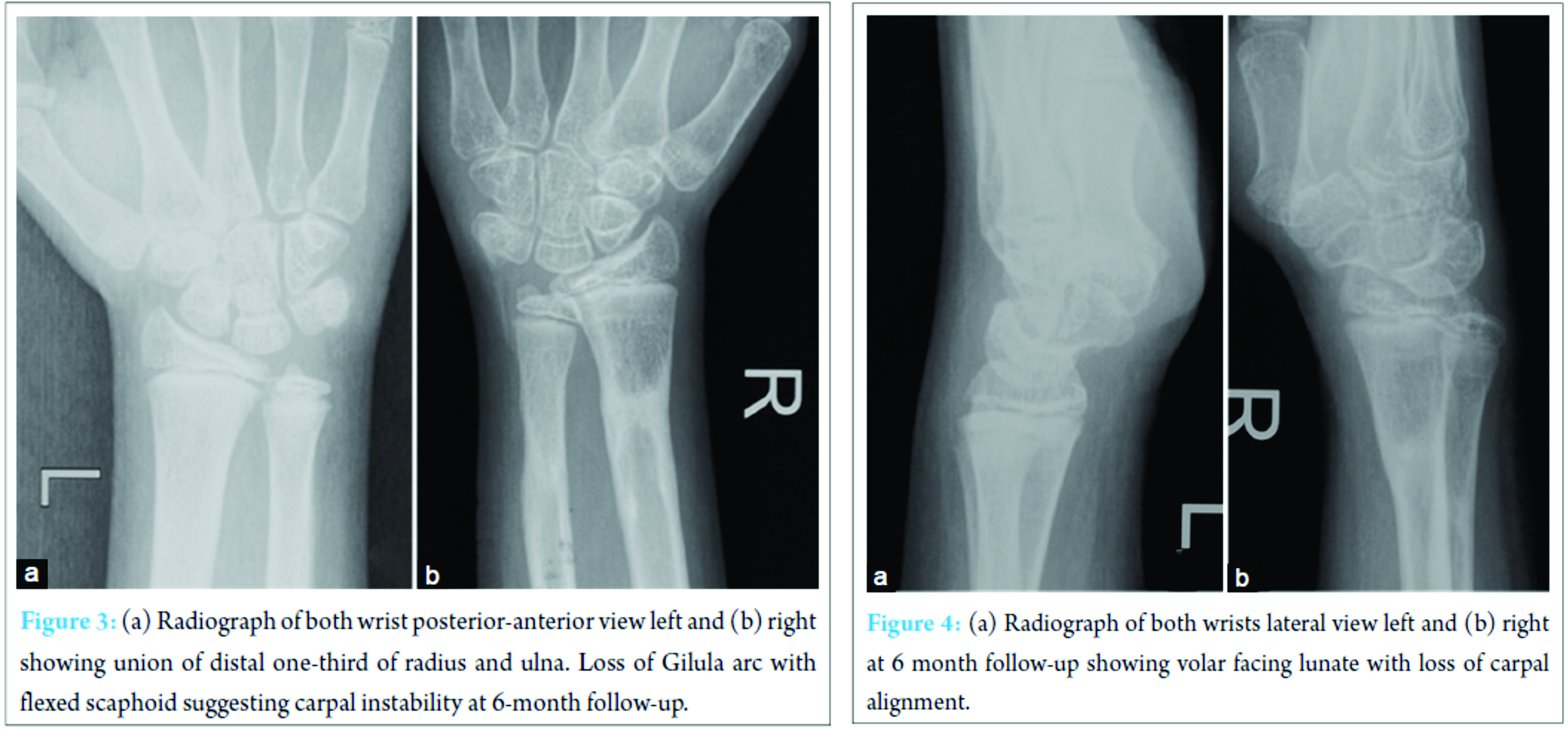 Carpal instability should be considered as a differential in patients presenting with chronic wrist pain and restricted movements following trauma. Reagan et al. classified carpal instability into four categories and lunato‑triquetral ligament is involved in stage three which leads to volar lunate instability [1]. Lunate instability is further divided into static or dynamic and acute or chronic. VISI is a condition in which there is pathologic volar flexion of the lunate, with or without a similar posture of the other proximal row carpal bones. Palmar flexion instability is less commonly recognized [1]. VISI is commonly seen in rheumatoid arthritis. Lunato‑triquetral ligament attrition due to congenital ligamentous laxity causes VISI. Posttraumatic volar lunate instability is an entity that can be missed during the initial traumatic event because of its subtle nature [2]. Posttraumatic carpal stability diagnosed at the earliest avoids advanced surgical procedures such as reconstruction and fusion of joint [3]. Earlier management prevents functional morbidity of wrist. Lunate instability in plain radiograph can be diagnosed with the alteration of various angles namely the loss of scapholunate angle, loss of alignment between the lunate, capitate and radius and increase in the capitolunate angle. Treatment options include from closed reduction and K‑wire fixation, dorsal capsulodesis, tenodesis, arthroscopic or open repair with reconstruction and finally arthrodesis [4]. Few cases have been reported in literature [5]. VISI is a missed injury in our case associated distal radius and ulna fracture [6]. This injury could be subtle in nature before reduction and fixation that led to delay in diagnosis or iatrogenic in nature after reduction of the fracture.