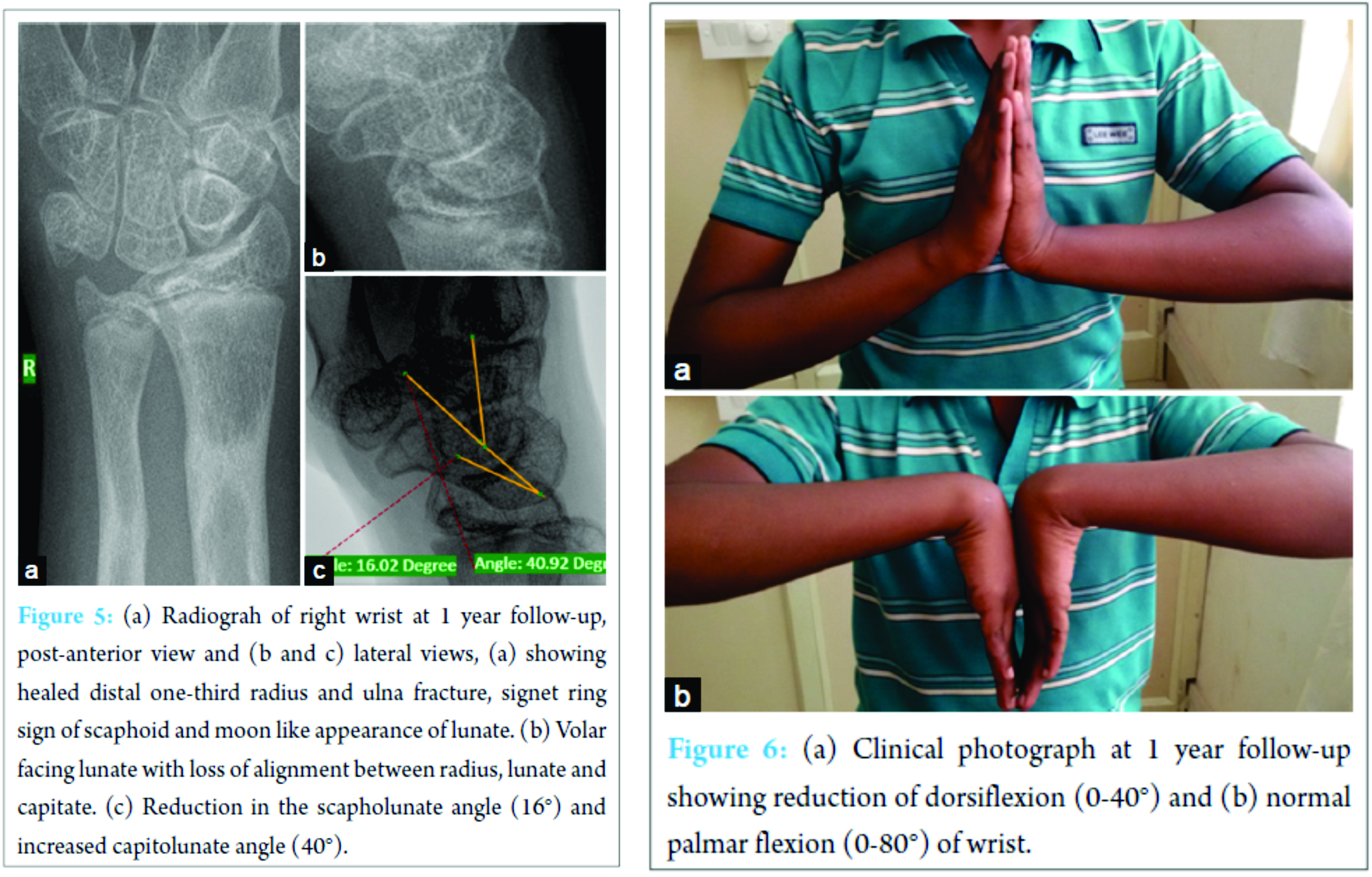 Initial X‑ray showed normal alignment of carpus before reduction. Serial radiographs during follow‑up showed a volar facing lunate with alteration of scapholunate and lunatocapitate angle and was diagnosed with a volar intercalated lunate instability (Fig. 5). The patient was put on strict rehabilitation protocol and the dorsiflexion improved from 0‑10° to 0‑40°. At 1 year follow‑up patient is still having restriction of dorsiflexion (Fig. 6) with volar lunate instability (Fig. 5). The patient is being planned for further procedure.