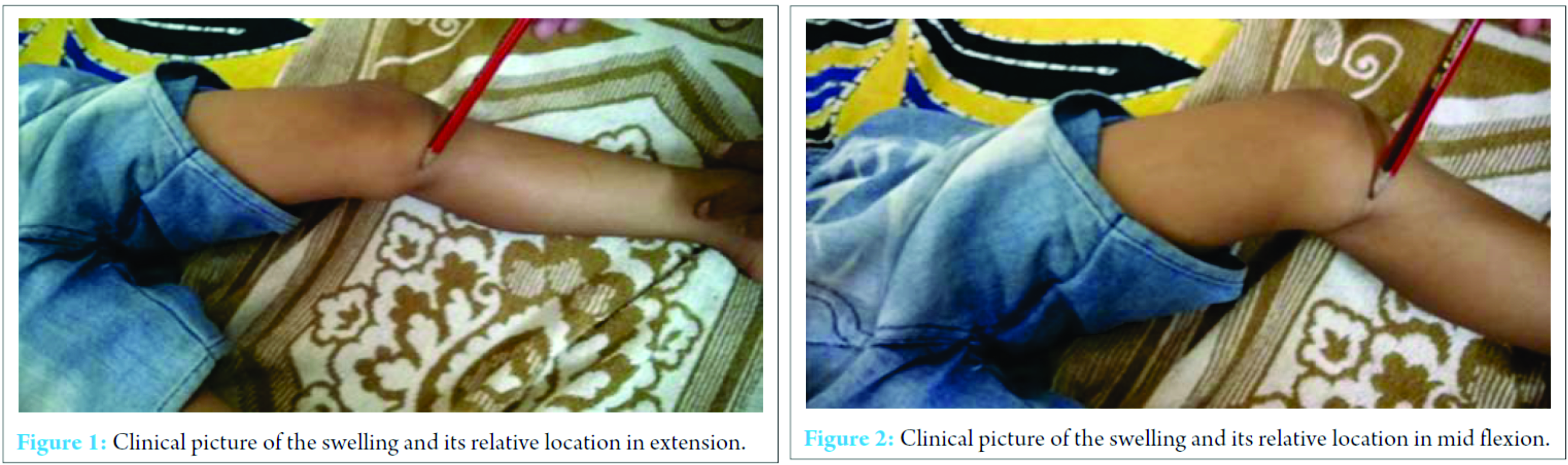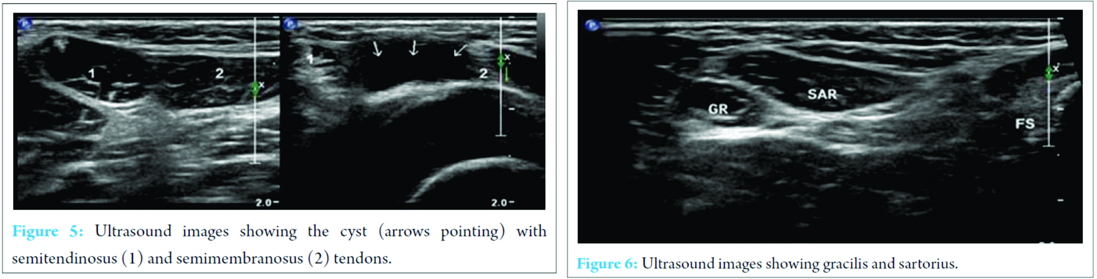 Case Report: A 4-year-old boy presented with painless soft tissue swelling over knee with no history of recent trauma. Radiograph was normal and USG showed a well-defined hypoechoic cystic lesion. Patient was taken for surgery and the lesion was removed. Lesion came out to be a ganglion cyst originating from the semitendinosus tendon. Post-operative USG was done to confirm complete removal of the ganglion.