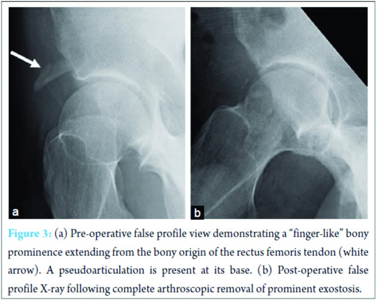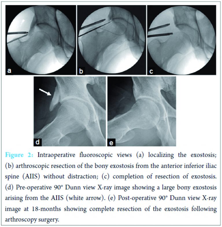 While the development of large exostosis in each of our cases was likely the primary cause of impingement-like pain and discomfort, the coexistence with intra-articular abnormalities may have been a contributing factor in each case. An arthroscopic technique was, therefore, utilized in this case series to perform the AIIS deformity resection and to treat the concomitant FAI and associated intra-articular pathology.