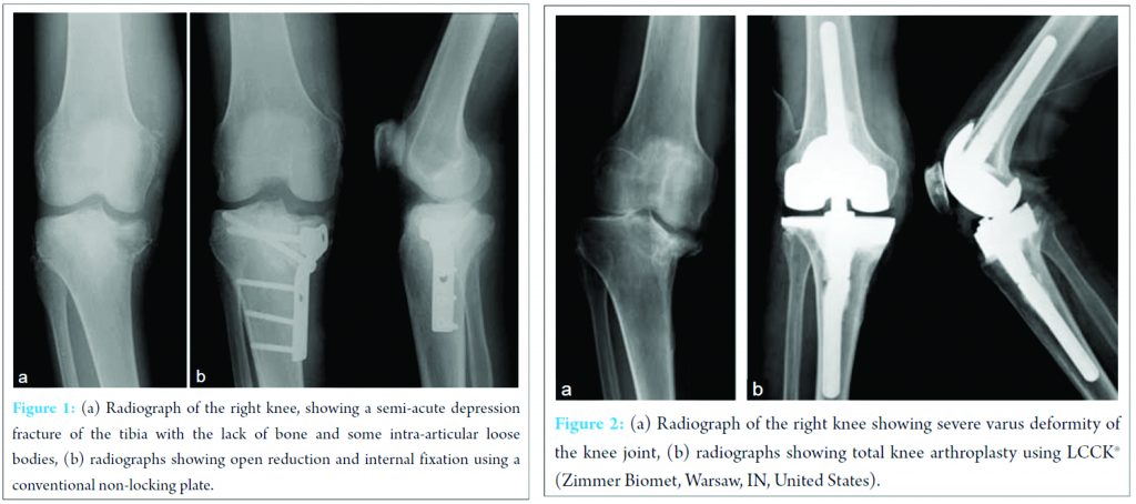 A 63-year-old man with syphilis and a body mass index of 19.6 kg/m2 presented with a painful swollen knee 1 month after slipping. Radiographs revealed a semi-acute depression fracture of the tibia with comparatively large defect of bone and some intra-articular loose bodies considering the pain. He had deep tendon hyporeflexia, hypo pallesthesia, disturbance of deep sensibility, and decreased protective sensation due to tabes dorsalis. Therefore, his right knee was diagnosed as a Charcot joint disease. Open reduction and internal fixation (ORIF) using a conventional non-locking plate was performed (Fig. 1). Varus deformity and delayed bone union gradually developed after the procedure. At this point, his clinical depression worsened and was accompanied by abnormal behavior. The results of the blood test TPLA 6600 (TLHA 5120 X) had deteriorated to TPLA 22000 (TPHA 10240 X). Tabes dorsalis had been treated with antibiotics (ampicillin). Despite the treatment, the patient had to be transferred to a psychiatric hospital because of aggravated neurologic manifestations. He was diagnosed with organic mental disorder caused by tabes dorsalis and was hospitalized for 2 months. 1 year later, ORIF metal removal was performed.