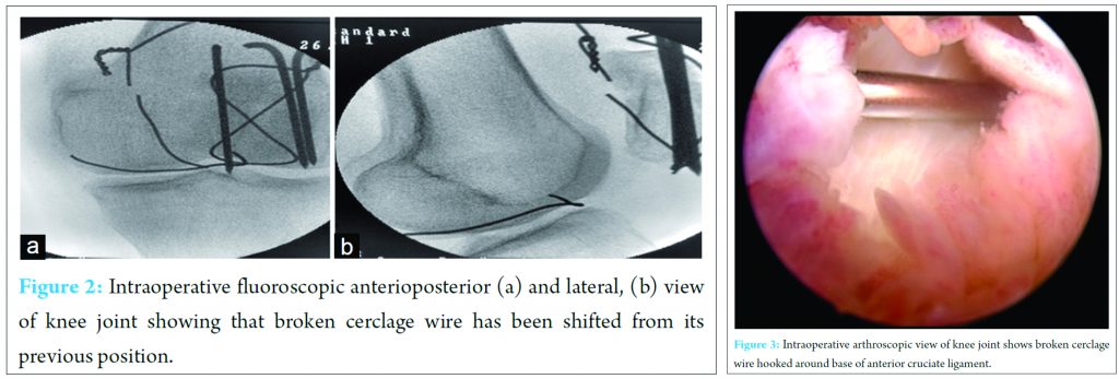 The inferio-medial segment of the broken cerclage wire was found to have migrated into the posterior compartment of the knee joint and hooked anteriorly at the base of anterior cruciate ligament.