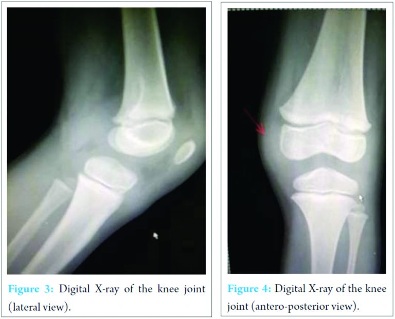 The physical examination revealed a palpable, well-defined 3 cm × 1.5 cm, subcutaneous swelling over the posteromedial aspect of the left knee joint. The swelling was non-tender and not moveable. It was not adherent to the overlying skin. There was no functional or neurological deficit associated (Fig. 1, 2).