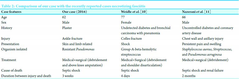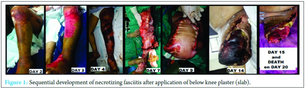 Necrotizing fasciitis is life-threatening rare complication of plaster and apart from high index of suspicion and prompt surgical debridement, author recommends proper pre-cleaning of limb, use of sterile water and adequate wrap for gypsum plasters.