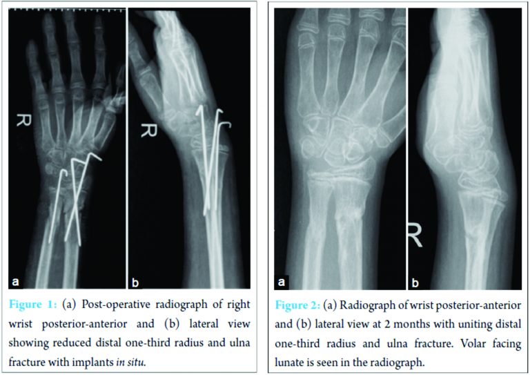 Case Report: A 13-year-old boy presented at 6 months following a fall with restriction of wrist movements. Patient had sustained a closed distal one-third both bones fracture forearm fixed with K-wire, and volar lunate instability was found during sequential follow-up.