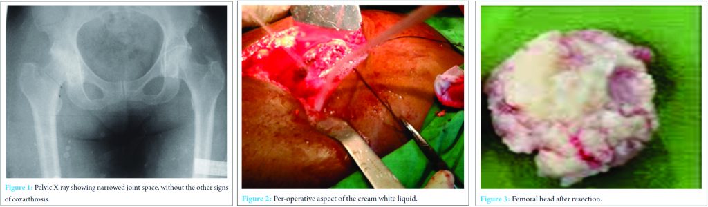 The subject was a 53-year-old housewife, who consulted in December 2013 for inflammatory pain in the right hip evolving for 3 months controlled with non-steroidal anti-inflammatory drugs, with a walking distance of about 100 m. The medical history revealed that she is HIV infected and on triple ARV for 1 year, with a CD4 count of 473/ml, the viral load was not documented. Evaluation of the right hip showed flexion/extension of 80/20, abduction/adduction of 40/20, internal rotation/external rotation of 20/15, a trendelenburg gait, and a limb length discrepancy of 3 cm. The muscle power of the gluteus medius was 4/5. There was amyotrophy of the right quadriceps muscle. The Merle d’Aubigne and postel hip score was evaluated to be 9/18. The anterior-posterior view of the pelvic X-ray (Fig. 1) shows joint space narrowing, loss of head sphericity, shortened hip length, with no other signs of coxarthrosis (sclerosis, geodes, osteophytes). These findings coupled with the patient’s history of immunosuppression were suggestive of a coxitis, which could be due to tuberculosis (TB) infection. However, an MRI scan was not done because it was unavailable, and the patient could not afford to do it due to financial constraints. The full blood count revealed a hemoglobin level of 13 g/dl, however, the white cell count was 8000 with 45% lymphocytes and 50% neutrophiles. The rest of the laboratory investigation was unremarkable.