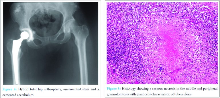 Case Report: The patient was a 53-year-old Black African woman, positive for the HIV, who was operated for implantation of a THA via the Hardinge approach indicated for a severe painful hip with restriction of joint movement and limp. A creamy-white liquid was noticed in the hip joint which was negative for urgent Gram-staining. The surgery was completed with the implantation of a hybrid THA. The post-operative period was uneventful, and she was put on antituberculous drugs following a positive histology result for TB, and to continue her antiretroviral drugs. She still has a satisfactory result for 3 years since her surgery.