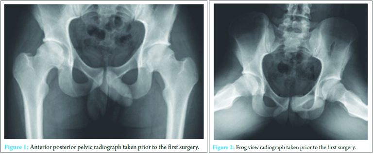 Heterotopic ossification (HO) after hip surgery is the formation of bone in non-skeletal tissue, usually between the muscle and the joint capsule. The mechanism and etiology of HO remain unclear. The lesion arises from the primitive mesenchymal cells, present at the site of injury, that are activated by the inflammatory mediators released from the injured tissue [1]. The interaction between injured periosteum and necrotic or damaged muscle may accelerate ectopic bone formation [2]. The clinical manifestations of HO have a wide spectrum. Lesions range from small clinically insignificant foci of ossification to large deposits of bone. HO after hip surgery may be associated with clinical sequelae such as pain, impingement, and decreased range of motion compromising surgical outcome. The reported rates of HO after hip arthroscopy without prophylaxis may be as high as 44% [3,4,5,6,7,8]. Low dose irradiation and non-steroidal anti-inflammatory medications (NSAIDs) are two common prophylactic methods used to prevent post-operative HO. Non-steroidal anti-inflammatory medications are effective in decreasing the formation of HO by suppressing the inflammatory process [9,10]. Randelli et al. [2] demonstrated that NSAID prophylaxis after arthroscopic femoroacetabular impingement treatment were effective in preventing HO. Amar et al. [11] did not find capsular closure to be a contributing factor to the formation of HO after hip arthroscopy. This paper presents the case of a patient treated with arthroscopic femoroacetabular osteoplasty and labral repair bilaterally. The patient received NSAID HO prophylaxis after the second surgery but did not receive any HO prophylaxis for the first procedure. The patient developed Grade 3 HO only on the non-prophylactic side. The clinical presentation, imaging, and intraoperative findings are described.