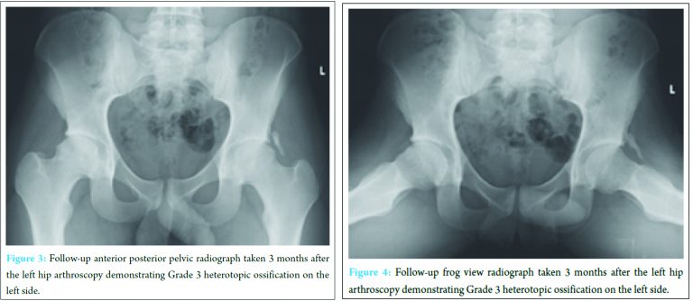 Intraoperative findings included chondral detachment at the chondrolabral junction in zone 3 and an adjacent partial labral tear. These were treated with chondroplasty, microfracture, acetabular osteoplasty and labral repair followed by osteoplasty of the femoral head-neck junction. No HO prophylaxis was given. Follow-up radiographs at 3 months after the left hip arthroscopy showed Grade 3 HO on the left side (Fig. 3 and 4). On the 2nd post-operative visit (following 6 weeks of non-weight bearing rehabilitation) the patient complained of contralateral (right-sided) hip pain.