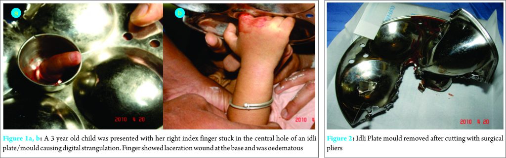 Finger injuries are not uncommon in children and most studies have mentioned that door crush injuries are the most common injuries in children less than 5 years age [1-3]. It is rare to find direct sharp injuries and its rarer to find injuries where fingers are stuck in hollow/ringed objects. We could find just one case which reported finger of a child stuck in Idli mould [4]. The following report outlines a similar case of digital strangulation caused by this kitchen utensil, idli plate mould.