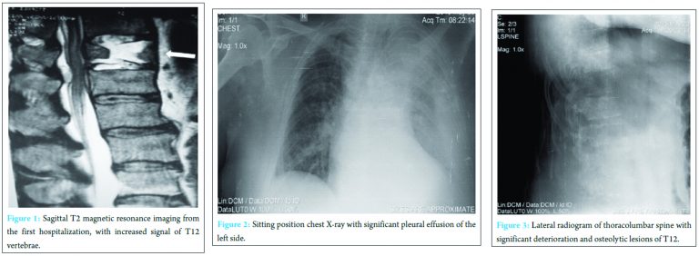 Conclusion: Physicians should be aware for this rare but potentially fatal spinal infection. Osteomyelitis of thoracic spine should be considered in the differential diagnosis of pleural effusion. More suspiciousness is needed due to the possibility of immunosuppression and relapse, even with sufficient antibiotic administration and negative inflammatory markers. Follow-up should be more frequent and accompanied with blood cultures taking.