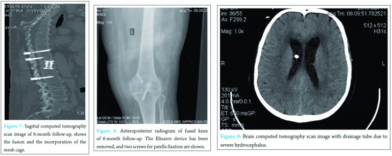 All sites required local debridement and secondary closure. The left knee fused completely 3 months following surgery. On the basis of antibiotic susceptibility pattern, quinolone and ceftriaxone were IV given. The patient received 3 months IV antibiotic treatment and was discharged with instructions for a monthly check of inflammatory markers. Antibiograms is the safe way for the antibiotics selection, although ciprofloxacin, 3rd generation cephalosporin, ampicillin, and chloramphenicol are the most common antibiotics in such infections. The IV administration was combined with our patient hospitalization due to his impaired general condition and the post-operative complications. The duration of the antibiotic treatment was determined on the basis of the evidence-based guidelines, to minimize relapse possibility. At the 6-month follow-up, CRP and ESR remained within normal limits. Radiograms and CT scan showed a good result of fusion in both sites (Fig. 7 and 8). The patient was free of pain, and he had started to return to his daily routine. There was not any sign of recurrence. Although 2 months later, our patient became anxious and his family found him with an altered state of consciousness and cognition. On admission to the hospital, our patient lost his consciousness and had to be intubated and transferred to intensive care unit. Brain CT scan revealed edema and hydrocephalus that required drainage tube installation (Fig. 9). The lumbar puncture of cerebrospinal fluid was indicative of viral infection. EEG showed slow waves and based on the previous medical history all possible cultures were taken. Blood cultures revealed again SE. Our patient did not recover from this meningoencephalitis, and his relatives decided to disconnect him from the ventilator on the day 11th being clinically dead. We believe that SE infection recurrence caused immunosuppression to this impaired patient making him unable to manage this central nervous system viral infection.