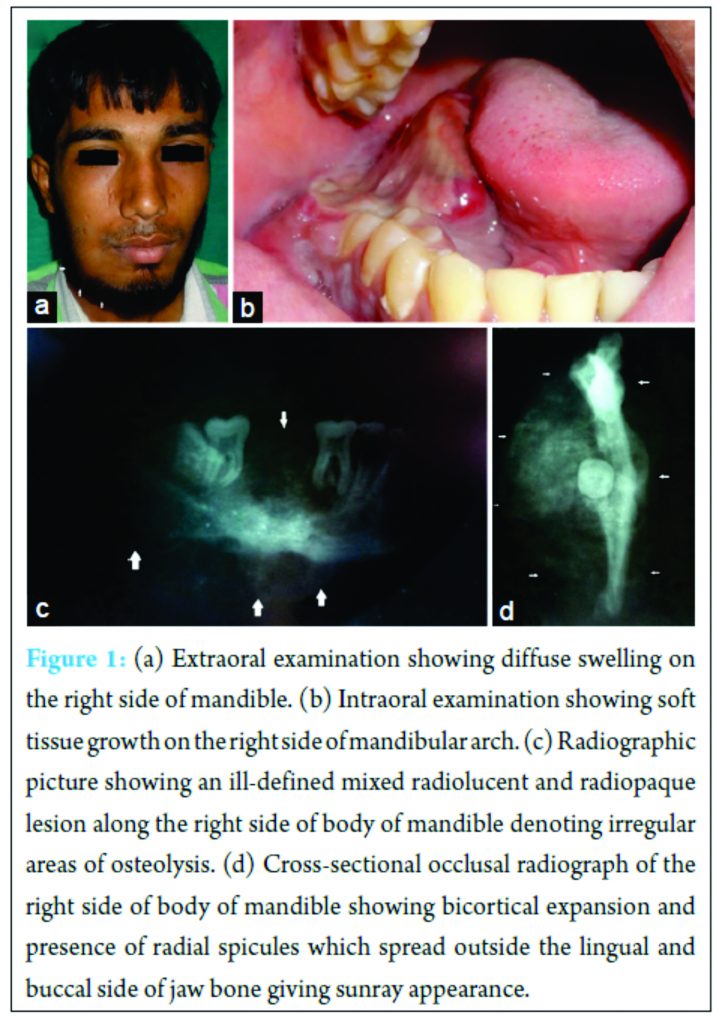 Osteosarcoma, sometimes referred to as osteogenic sarcoma, is the most common primary bone tumor seen in adolescents and young adults [1]. Osteosarcomas of the jaws are rare and they are highly malignant neoplasms of the bone whose diagnoses are challenging [2]. There is a predilection of mandibular osteosarcomas in older patients (mean age: 34-36 years) [1]. It accounts for about 23% of all sarcomas [3]. About 4-6% osteosarcomas occur in the maxillofacial region [4]. The exact cause is unknown, but there are various predisposing factors that may cause osteosarcoma. These include rapid bone growth (increased incidence during adolescent growth spurt), person receiving radiation, genetic predisposition, bone dysplasias including Paget’s disease, fibrous dysplasia, enchondromatosis, hereditary multiple exostoses, and retinoblastoma [5]. The radiographic appearances of these tumors are radiolucent, radiopaque, or mixed. Radiographic appearance of sunburst pattern is classic for osteosarcoma but is not a sensitive or specific feature. Garrigton et al. mentioned that the roentgenographic evidence of symmetrically widened periodontal membrane space was a significant early finding in jaw osteosarcoma. The extent of tumor in both bone and soft tissue can be best appreciated using computed tomography (CT) or magnetic resonance imaging which shows the formation of irregular endosteal and extracortical bone as well as destroyed or obliterated cortex [5]. To confirm the diagnosis, biopsy is needed. These neoplasms often show a typical clinical behavior and varied radiological appearances. They present wide spectrum of histopathological features. Commonly seen variants are osteoblastic, chondroblastic, and fibroblastic, of which chondroblastic variant predominates. Few other variants may show fibrohistiocytic differentiation, which may be mistaken for malignant fibrous histiocytoma. Some osteosarcomas histologically resemble osteoblastomas. Hence, it is necessary to differentiate between all these lesions as the treatment plan for all these lesions is different. Rarely, tumor may show a spectrum of histopathology. Here, a case report of a 21-year-old male patient is described which showed varied histomorphologic pattern causing a diagnostic dilemma.