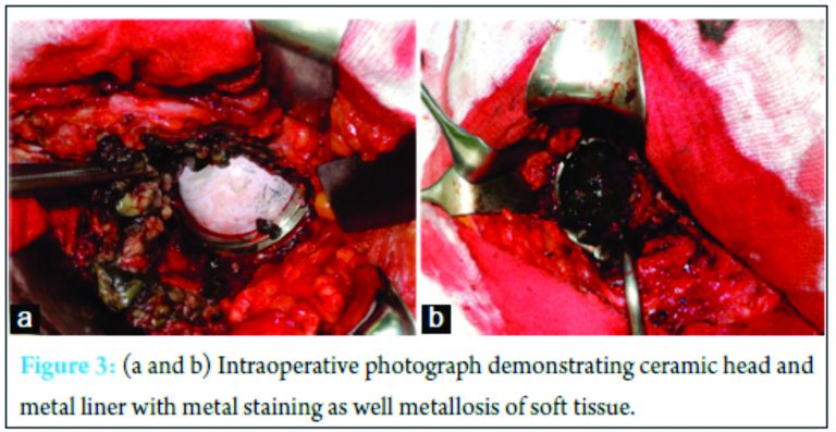 Even mild signs and symptoms of soft tissue reaction should be aggressively investigated for metallosis of implant in the absence of any radiographic loosening. The surgeon should aware of this complication during a presentation in revision cases to prevent rapid progression of cup loosening.