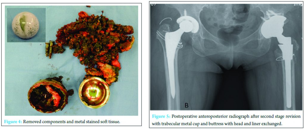 The intraoperative frozen section of mass showed less than 5 polymorphonuclear leukocytes per high-power field in all the three specimens. Intraoperative dark gray colored fluid analysis was done with 58% polymorphonuclear, 39% lymphocytic, and 3% mononuclear cells. After aggressive debridement of metallic and necrotic tissue, acetabular cavitary defects were filled with mixed autogenous bone graft and allograft bone chips bone. On the acetabular side, the patient was revised with 52 mm trabecular metal shell (52 mm) with metal buttress (Fig. 5) to address the superior bone defect (zimmer, warsaw, Indiana, USA). Highly cross-linked polyethylene liner was applied with 32 mm biolox delta ceramic femoral head (Depuy, Jhonson and Jhonson co., Warsaw, IN).