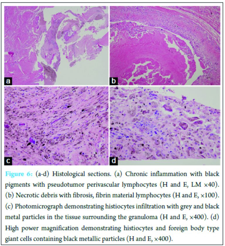 Operative cultures for soft tissue and fluid were both negative for infection. Histopathology was consistent with metallosis. For each tissue fragment, sections were routinely stained with hematoxylin and eosin and examined with light microscopy. On microscopic examination, the inner surface covered with eosinophilic fibrinoid material with local fibrotic tissue. The histopathology analysis supports morphology consistent with the metallosis as an inflammatory response to metal particles. It revealed abundant lymphocytes, histiocytes, occasional plasma cells, foreign body type giant cells, and black metal particles (Fig. 6a-d). After 6 weeks of partial weight bearing, the patient was fully mobilized with full weight bearing over 6-week period. At 6 month repeat serum metal ion analysis showed decrease level with cobalt and chromium levels of 1.3, 2.54 µg/L, respectively. The recent cobalt and chromium measurements were 0.66 and 0.42 µg/L, respectively. The patient with continued improvements in function with full weight bearing walking at last follow-up with Harris hip score of 87 compared with 58 preoperatively.