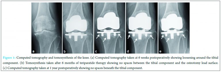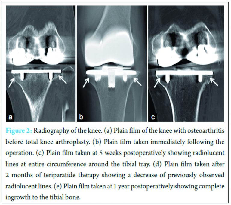 Conclusion: This case showed that a weekly teriparatide administration of 56.5 μg improved initial loosening of the tibial implant in cementless TKA. Administration of teriparatide in cases of the osteoporotic patient who has loosening in cementless TKA may be a useful adjuvant to achieve bone in growth again.