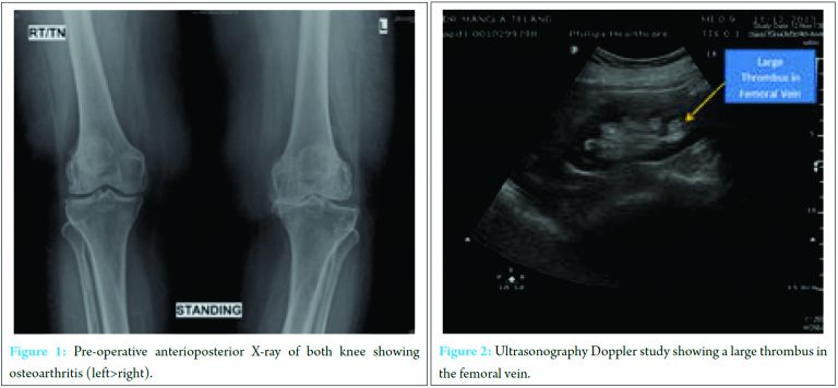 Pulmonary thromboembolism (PTE) is one of the most serious complications of long recumbency in hospitalized patients. Etiology of deep vein thrombosis (DVT) has been explained by Virchow’s triad which stated that thrombosis is related to vessel wall changes, blood flow and coagulability [1]. Venostasis and tissue hypoxia with resultant endothelial changes are the major cause of DVT after total knee arthroplasty (TKA). Prolonged immobilization due to severe osteoarthritis of knee is itself a contributing factor for the development of DVT [2]. The classical sign and symptoms of DVT include pain in calf at rest and on foot dorsiflexion, pitting edema above the medial malleolus and palpable difference in temperature between the legs. Some patients may develop PTE without showing any clinical signs of DVT, so other tests are necessary for diagnosis of DVT [3]. Most routinely done investigation is venous Doppler, which is nonexpensive, noninvasive and readily available. Venous Doppler shows sensitivity of 89% and specificity of 100% [4]. We are presenting a case report of a patient in which TKA was done in a diagnosed case of DVT. We assessed both the patient specific predisposing factors and procedure-associated risk factors [5] of DVT in this patient. This is a rare case report as TKA in a diagnosed case of DVT had not been published in written literature.