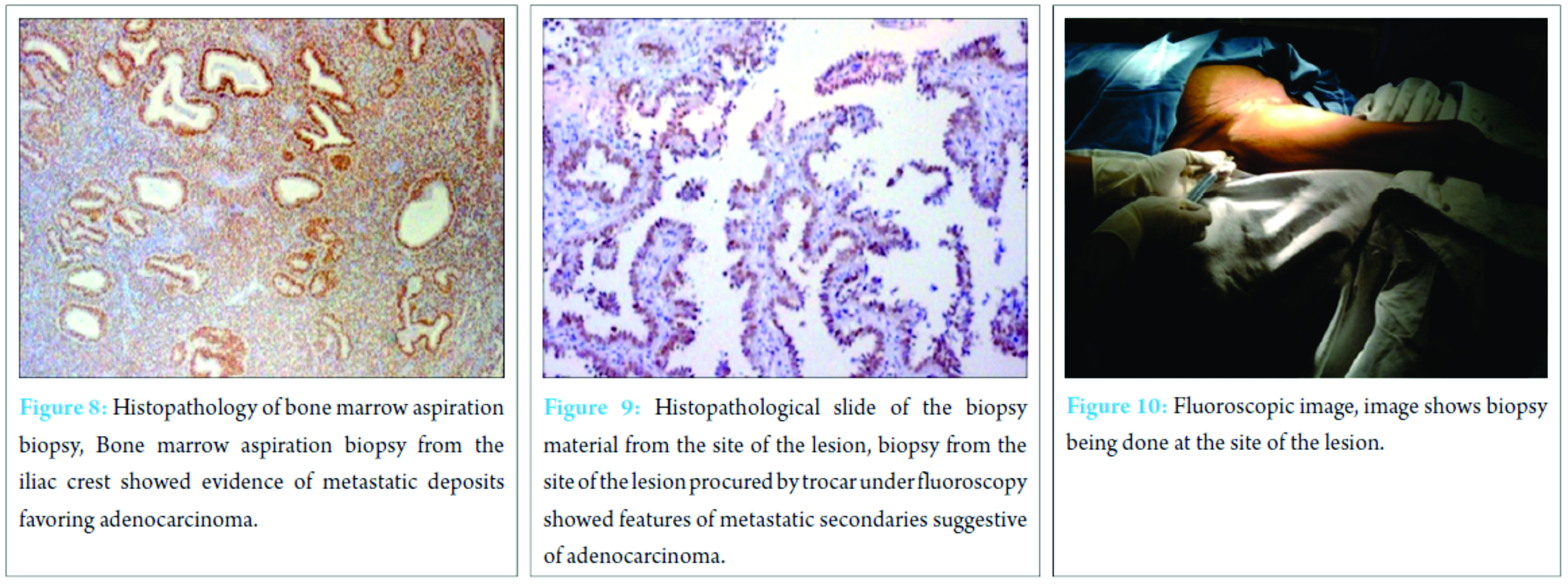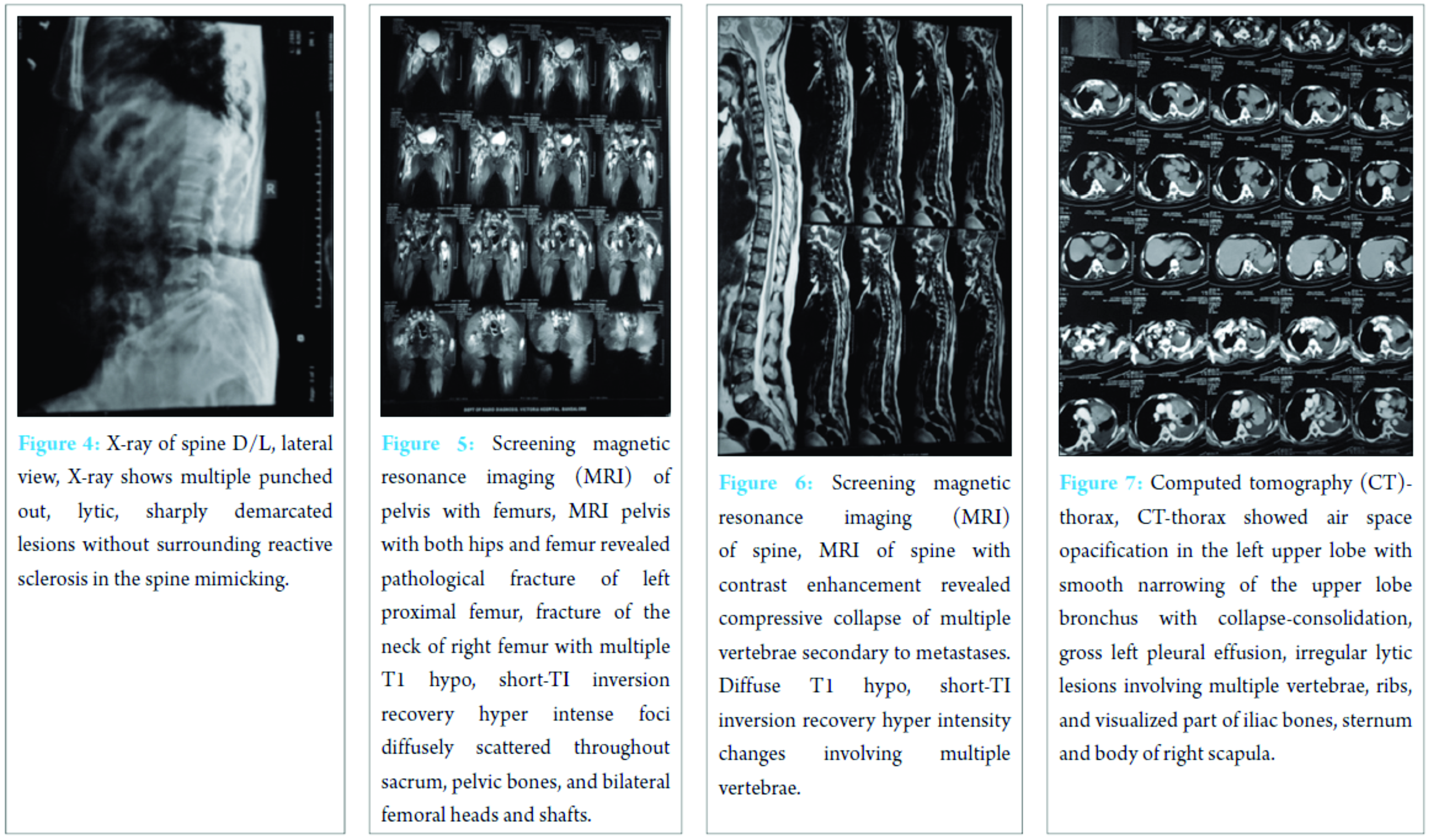 Conclusion: While dealing with patients with extensive skeletal lesions and pathological fractures, secondaries due to adenocarcinoma elsewhere should be kept in mind along with other probabilities such as multiple myeloma.