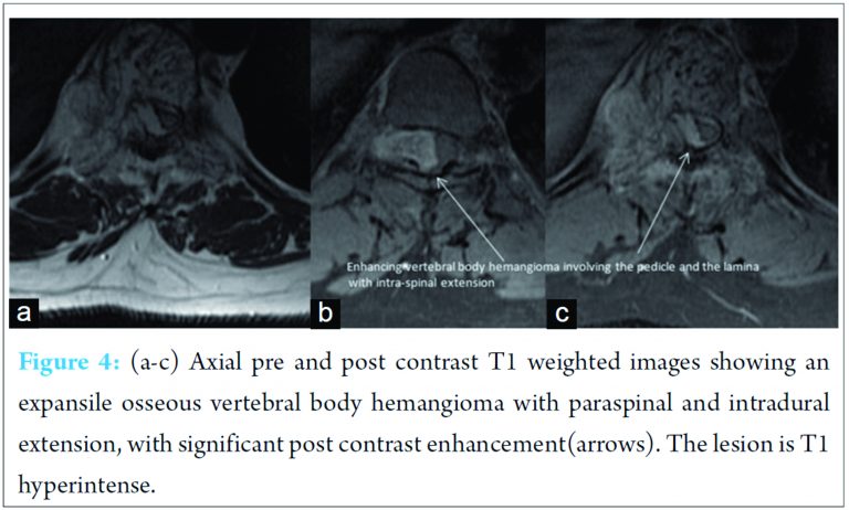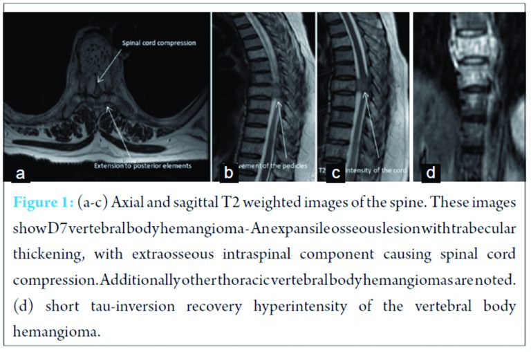 Vertebral body hemangioma is a common condition with various case series reporting its incidence to be between 10% and 27% [1]. In the bone, they are of dysembryogenetic origin otherwise also called as hamartomatous lesions. They have high vascularity, intralesional oedema and intralesional fat [2]. Most hemangiomas are small, about a third are multiple and only 0.9-1.2% of hemangiomas cause symptoms [1,3]. Very few hemangiomas are aggressive causing bony expansion and extraosseous extension, with extension into the paraspinal and epidural spaces [4,5,6]. New onset of back pain with subacute progression of a thoracic myelopathy has been reported as the most common presentation for patients with neurological deficit due to aggressive vertebral body hemangiomas [4]. Thus, it is important to recognize this entity, include it in the clinical differential diagnosis and to look for the extensions of such vertebral body hemangiomas.