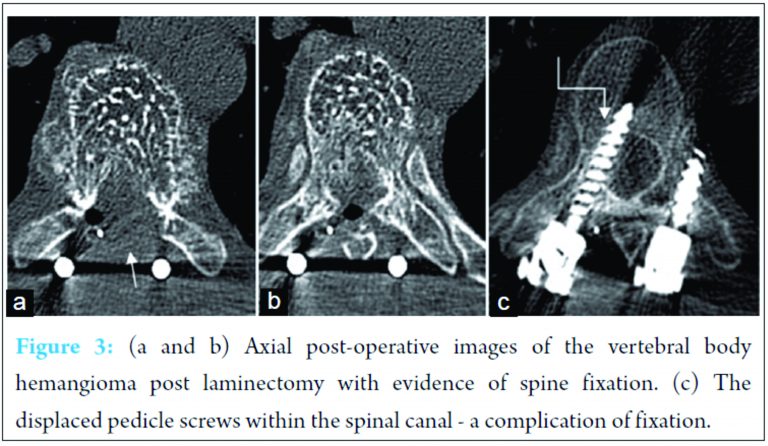 A clinical decision to perform surgical decompression was taken for the first patient. Intraoperatively, a mass was seen arising from the vertebral body and extending into the spinal canal. Tumor showed a tuft of vessels in the bony tissue which had very high vascularity. Histopathology confirmed the lesion to be a hemangioma. Laminectomy was done for the patient to cause spinal decompression. Pedicle screw was placed into the vertebral body affected by the aggressive vertebral body hemangioma. Difficulty was faced while passing the pedicle screw into the normal vertebra (superior) during the surgery, and one of the pedicle screws inadvertently indented the cord after being displaced into the spinal canal (Fig. 3). Displacement of the pedicle screws is a known complication which can cause spinal cord compromise. This case report reiterates the need for the use of alternate treatment modalities like radiotherapy and embolization in aggressive vertebral body hemangiomas.