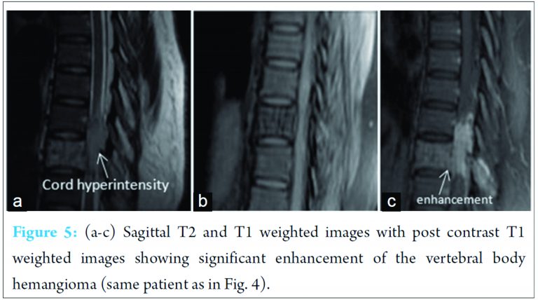Conclusion: Thus, these case reports help identify the characteristic imaging features of an aggressive vertebral body hemangioma, preventing unnecessary and often risky biopsy. The clinical symptoms of the patient can be relieved by surgical decompression of the posterior elements or by radiotherapy. Use of onyx for intraarterial embolization is now believed to be the safest and most efficacious method for treatment of aggressive vertebral body hemangiomas. However, in the absence of definite guidelines, a multicentric study is warranted to prove that embolization with onyx is better than surgery with post-operative radiotherapy.