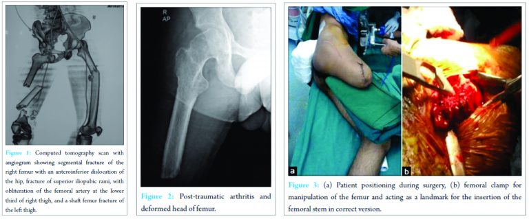We present a case of 30-year-old male who had a road-traffic accident presenting to us from a remote peripheral center after 24 h of the injury. He sustained bilateral lower limb injuries. On presentation, he was conscious and coherent but in hypovolemic shock. He was managed as per advanced trauma life support guidelines and was made hemodynamically stable. Clinical examination revealed an unreduced right hip dislocation, fracture deformities of both the thighs, an open wound over lower third of right thigh with bruising and swelling, and an open wound over anterior right leg. The right lower limb continued to be cold and clammy after hemodynamic stabilization, with absent distal pulses below the knee. Trauma series X-rays were taken along with a computed tomography angiogram (Fig. 1) which revealed a segmental fracture of the right femur with anteroinferior dislocation of the hip, fracture of superior iliopubic rami, with obliteration of the femoral artery at the distal femur and a shaft femur fracture of the left thigh. After hematological and serological work up and multidisciplinary assessment and keeping in mind the delayed presentation (beyond 24 h), the decision to go for above-knee amputation of right lower limb was taken and the patient was planned for emergency surgery. On exploration, the popliteal artery was seen to be lacerated at multiple points with distal thrombosis and above-knee amputation was carried out. The right hip was impacted in the obturator foramen which could not be reduced by closed attempts, hence required open reduction, done by a posterior approach. The head of the femur had impaction injuries with full thickness cartilage loss in the superolateral region. An external fixator was given to stabilize the left femur fracture, which was later converted to interlocking nailing at 5th postoperative day. The patient had an uneventful recovery and underwent supervised physiotherapy. At 2-month follow-up, when the patient was advised for weight bearing with an above-knee prosthesis for amputated right lower limb along with axillary crutches, he complained of severe pain in the right hip and was unable to weight bear. Further 1 month of non-weight bearing was advised to heal the rami fracture. Radiographs of the right hip at 3-month follow-up showed an evidence of posttraumatic arthritis and deformed head of femur (Fig. 2). To alleviate his painful hip and mobilize the patient, a decision of THR was taken.