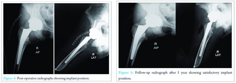 The patient tolerated the procedure well. The immediate postoperative period was uneventful. There was no infection, deep vein thrombosis, dislocation, or any other major complications. Postoperative radiographs showed proper placement of prosthesis (Fig. 4). He was allowed to be seated and perform isometric exercises after 48 hours of the procedure. He stayed in the hospital for 2 weeks till staple removal. During his hospitalization, he underwent supervised physiotherapy and was allowed full weight-bearing from postoperative day 2 with the help of previous exo-prosthesis and walking aid. He was followed up regularly till 12 months (Fig. 5). Harris hip score improved from preoperatively 36-80 at last follow-up. The patient continues to walk painlessly without any walking aid. X-ray at last follow-up shows well-incorporated femoral and acetabular components without any sign of osteolysis or subsidence.