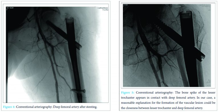 Hip fractures in older patients are the most common fractures treated by orthopedic surgeons. The incidence increases with age and degree of osteoporosis. The most frequent traumatic mechanism is a low energy fall from a standing height [5]. Proximal femoral fractures may be treated using different techniques of fixation. Screws or partial arthroplasty proves to be efficient for the synthesis of intracapsular fractures, whereas nails and plates are the most commonly employed for extracapsular fractures. In our case, we treated a 31-A2 fracture with a gamma nail. The role of intramedullary fixation for the treatment of this kind of fracture is still debated. Anyway, gamma nail is often preferred to slide hip screws, especially, because of easy handling instrumentarium and implant versatility. According to many authors, gamma nail has proved to be a safe and efficient fixation of pertrochanteric fractures [6]. Vascular complications after intramedullary fixation of pertrochanteric fracture are rare. These complications can develop after fracture during intramedullary hip nailing and displacing of bone fragment during fracture or repair. Furthermore, some authors suggest that manipulation of atherosclerotic vessels of the leg on the fracture table may injure their brittle endothelium with an increased risk of bleeding and thromboembolic events. Vascular injuries may be hemorrhagic or thrombotic, acute (hemorrhage), or delayed (pseudoaneurysm formation). Regardless of the type of vascular lesion, the most frequently injured vessel is the deep femoral artery followed by its perforating branches [4]. False aneurysms or pseudoaneurysms are surrounded by a thin fibrous capsule in contrast to true aneurysms that consist of the true layers of the arterial wall. The fibrin capsule is made of soft tissues and/or hematoma adjacent the vessel. There is a high risk of enlargement and rapture of the vessel, in particular, when the dimension of the pseudoaneurysm is superior to 3 cm. Rapid expansion, infection, skin or soft tissue necrosis, neuropathy, distal ischemia, pain, or rupture are the most important indications for repair [7]. The incidence of pseudoaneurysm after hip fracture is very low (0.21% of incidence) and rarely reported as a consequence of dislocated bone fragments. According to literature, arterial damages can occur because of bone spikes, tip of the screws, drills, displaced implants, and retraction of surrounding tissue [8]. In our report, X-ray imaging after surgery shows the proximal migration of lesser trochanteric fragment, due to the action of iliopsoas that fits on the lesser trochanter, near the pseudoaneurysm. According to symptoms and instrumental studies, it seems that dislocated fragment may have damaged the deep femoral artery that lies near proximal femur (Fig. 5). However, in almost 25% of pertrochanteric fracture, the lesser trochanter was involved, but vascular complications rarely occur, probably thanks to vessels elasticity. Clinical manifestations of a false aneurysm after hip fracture have been reported between 3 days and 14 years, but in cases of dislocated lesser trochanter being responsible for vascular lesion, these manifestations are more frequent between 18 and 36 days. Probably clinical appearance of the pseudoaneurysm is delayed until the patient starts mobilization that can dislocate bone fragments. In this case, we found the pseudoaneurysm 16 days after surgery, below the average reported in literature. Often it is difficult to identify this complication because of non-specific symptoms including pain, edema, and swelling that are common after hip surgery. We should suspect a pseudoaneurysm if the patient presents falling of hemoglobin level, pulsatile swelling, or venous engorgement, and we can diagnose this complication by duplex ultrasound (US), conventional angiography, and computed tomography (CT) angiography [9]. US is the method of choice for diagnosis of pseudoaneurysm with sensitivity between 94 and 97%. As in our case, conventional angiography (or CT-angiography) can be useful to confirm and to better define the vascular lesion. There are numerous treatment options for deep femoral artery pseudoaneurysm: Conservative management for smaller aneurysms, US-guided compression, percutaneous US-guided thrombin injection, percutaneous US-guided collagen injection, insertion of coils, covered stents, and open surgery [10]. The treatment we chose consisted in positioning an endovascular stent covered by polytetrafluoroethylene. After the procedure, symptoms improved and the patient was able to resume the rehabilitation program a few days later.