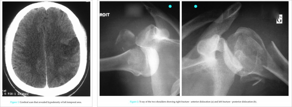 Case Report: An architect of 36-year-old, right-handed, was admitted in emergency department for loss of knowledge of progressive installation. At admission the blood pressure, pulse, and temperature were normal. There was a right hemiparesis predominantly in brachiofacial side and an aphasia. After intensive resuscitation measures, the cerebral computed tomography scan revealed a left temporoparietal hypodensity area affecting the middle cerebral artery superficial territory with a mass effect compatible with acute ischemic stroke. During the hospitalization, episodes of generalized tonic-clonic convulsions appeared with a fever at 39°C and a leukocytosis at 35 thousand on the 5th day. These convulsions caused on the right shoulder an anterior dislocation under coracoid, associated with a fracture of the greater tubercle and on the left shoulder, posterior dislocation with much displaced comminuted articular proximal humeral fracture. We did reduction by external maneuvers for the right shoulder and open reduction with internal fixation by anatomical plate of left shoulder lesions. In the immediate aftermath of surgery, he presented episodes of agitation which led to the dismantling of the left shoulder fixation. He was evacuated to the North Country where an ablation of the left shoulder material and stabilization by locked plate were carried out. The sequelae were marked by the occurrence of an osteomyelitis with osteolysis of the entire upper right humerus extremity. It will require an inverted prosthesis.