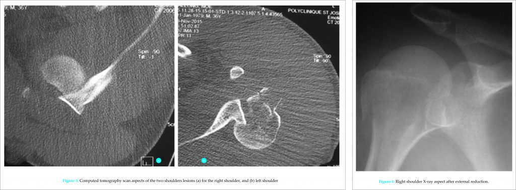 The rare cases of dislocation of bilateral shoulder fractures occur during epileptic seizures or in the course of trauma that occurs during convulsions [4]. The trauma may be due to a direct impact of the shoulders on objects near the patient or falls. Blackstone evoked the triad or triple E composed of epilepsy, electrocution, and external trauma to explain the circumstances in which these lesions occur [5]. The new fact is the divergence in the migration of the two fractured humeral heads (right anterior and left posterior) in our stroke patient. This divergent character of the dislocated of both shoulders suggests that the lesions did not occur simultaneously but rather sequentially. Because about to Pushpakumara et al. [3] humerus neck fracture can also accompany simultaneous shoulder dislocation either in the anterior or posterior plane. On the right (side with the paralysis), it could be considered that during a convulsion, weak contractions of the lateral rotators made the anterior dislocation possible, especially if the limb was in abduction and lateral rotation, the subscapularis latch being weakened by the paresis [4]. In these conditions, an attempt by the parents of the entourage to keep the patient in supine position in bed [3] by pressing on the anterior face of the distal arm thus achieves the antepulsion and the migration of the humeral head forward. The percussion of the head on the antero-inferior pole of the glenoid cavity in other convulsions would have caused the fracture of the right greater tubercle. On the left side, the persistence of the seizures would explain to the left shoulder probably in adduction, internal rotation and flexion, the propulsion of the humeral head back and top of the glenoid cavity as Shaw and all have described [6]. The fracture comminution of the upper humerus extremity would be due to the repeated impaction of the latter during the various convulsive seizures. This hypothesis is supported by the importance of the swelling and extent of bruising observed on the left shoulder. Thus, to the triple syndrome E described by Bradestone in 2001 to summarize the circumstances of these bilateral shoulder fracture dislocations [5], we could add, considering the stroke involved in our patient, and the letter S of the word stroke. The triple E would then become SEEE. The other aspect that caught our attention in this young patient was the difficulty of choosing the mode of reconstruction and fixation of the left comminuted fracture so that it resists any convulsive seizures in operative continuations. In this context, the locked plate seems to be an interesting solution even if it is not the guarantee of the expected anatomical and functional results [7]. The persistence of convulsions after surgery was, unfortunately, the cause of the secondary displacement observed in our case at the left shoulder. The reconstruction of the humeral head with the addition of bone and the most solid fixation possible so that the assembly can mechanically withstand the possible convulsive seizures in the postoperative period are therefore elements to be taken into account. Moreover, consultation with neurologists and anesthetists is essential to limit the occurrence of convulsive seizures in the post-operative period by appropriate treatments to preserve the reconstruction of the humeral head.
