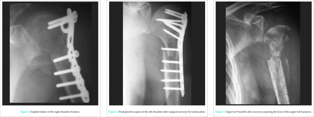 The CT scan has detailed bone lesions (Fig. 3). There was no notion of falling during or after these convulsions. The following day, the traumatic lesions were reduced by external maneuvers for the right shoulder (Fig. 4) and open reduction and internal fixation by anatomical plate of left shoulder lesions through a transdeltoid longitudinal approach. The two shoulders were immobilized complementarily by removable splints arm to the body. In the immediate aftermath of surgery, he presented episodes of agitation which led to the dismantling of the left shoulder internal fixation (Fig. 5). The improvement of its neurological state and of the biological markers toward the 15th day allowed a reprise of the left shoulder with contribution of graft and a fixation of the major tubercle on the right.
