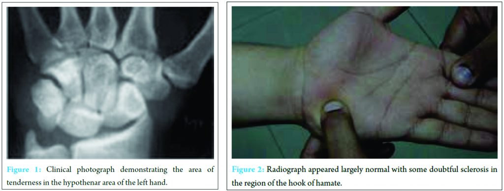 A 23-year-old club team cricketer, who was a right-handed batsman, presented to us with pain in the ulnar side of the left wrist and in the hypothenar area (nondominant hand) since 7 weeks; this was insidious in onset and gradually progressive in intensity. He had no definite history of any acute trauma to this region. Pain typically worsened during batting, and he had difficulty in gripping the bat, and could not execute powerful strokes. On clinical examination, he had deep point tenderness over the hook of the hamate region (Fig. 1). There was no swelling in the region; but grip strength was reduced compared to the opposite side. No symptoms of ulnar nerve compression were elicited. Plain radiographs revealed a sclerotic area in the hamate but were largely inconclusive (Fig. 2).